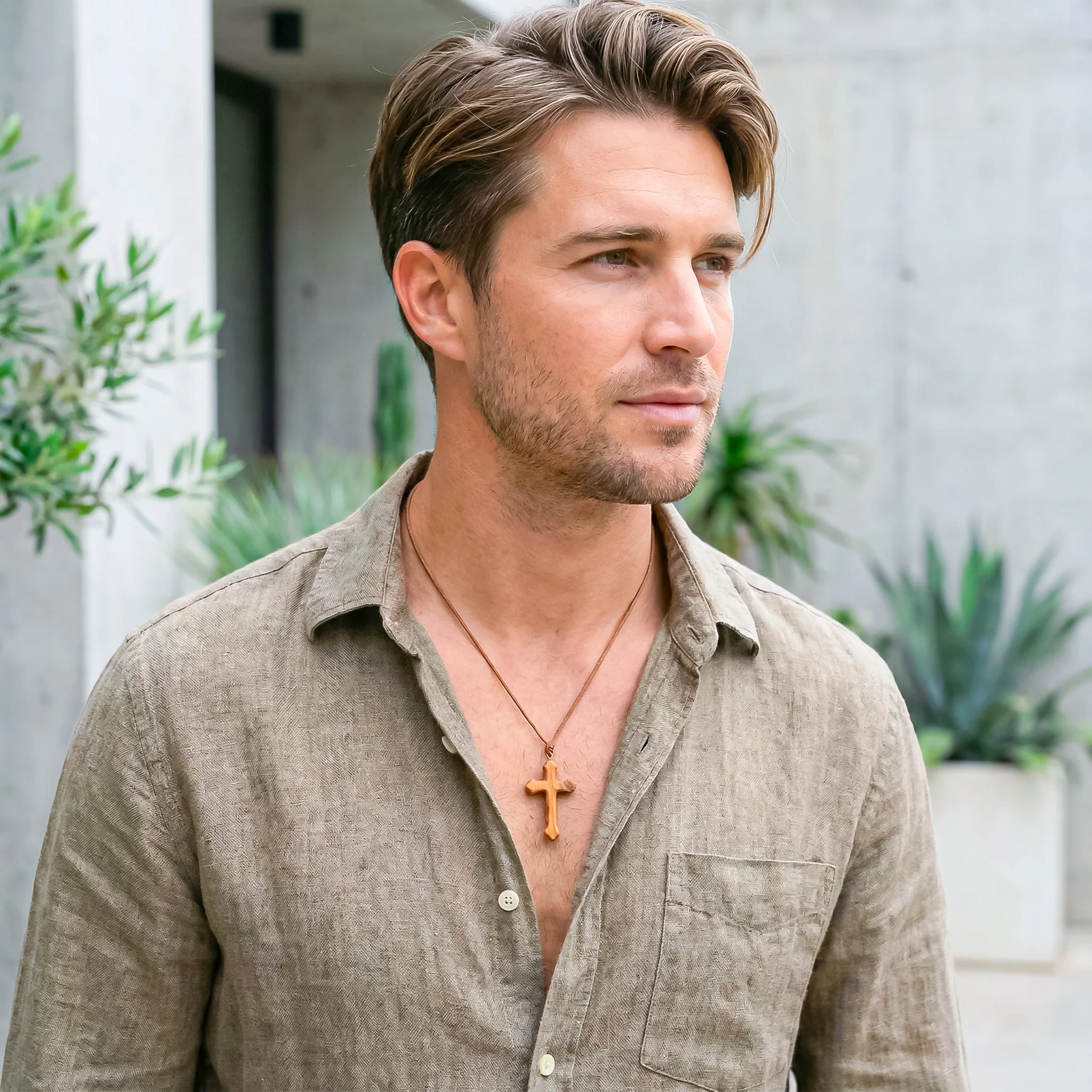 una cruz de madera de olivo, tallada con mimo y pulida hasta conseguir un acabado cálido, suave y lleno de carácter.