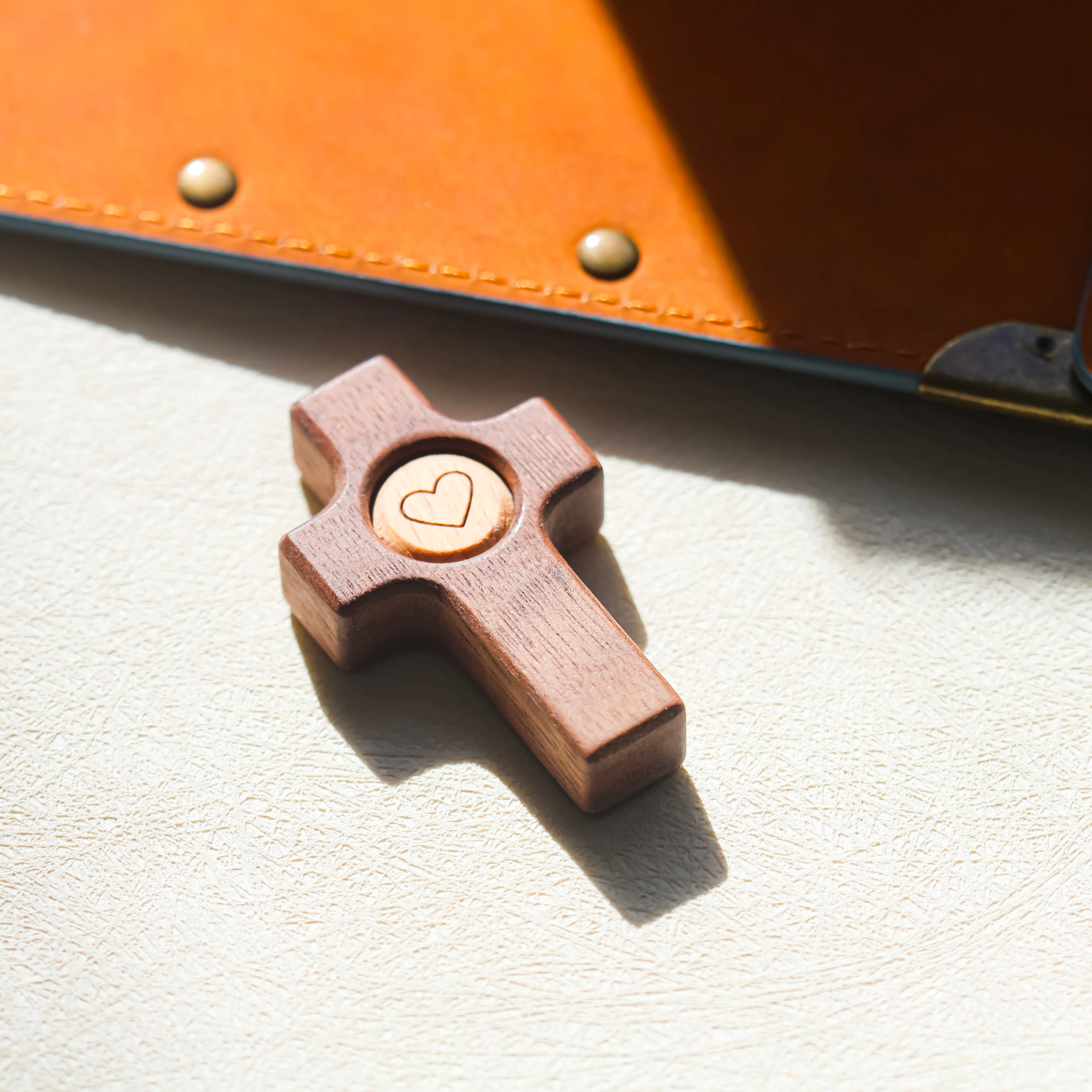 El grabado del corazón en el centro de la cruz representa la unión entre fe y amor. Es un detalle sencillo y a la vez poderoso, que convierte esta pieza en mucho más que un objeto decorativo: es un símbolo de conexión, ternura y espiritualidad.